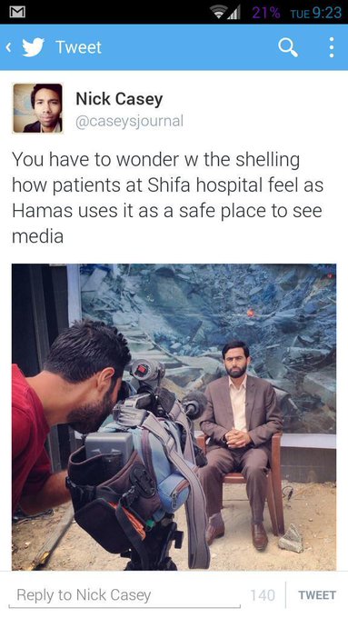 | "Vous devez vous demander comment se sentent les patients de l’hôpital lorsque le Hamas s'en sert comme lieu sûr pour s'exprimer devant les médias" Nick Casey